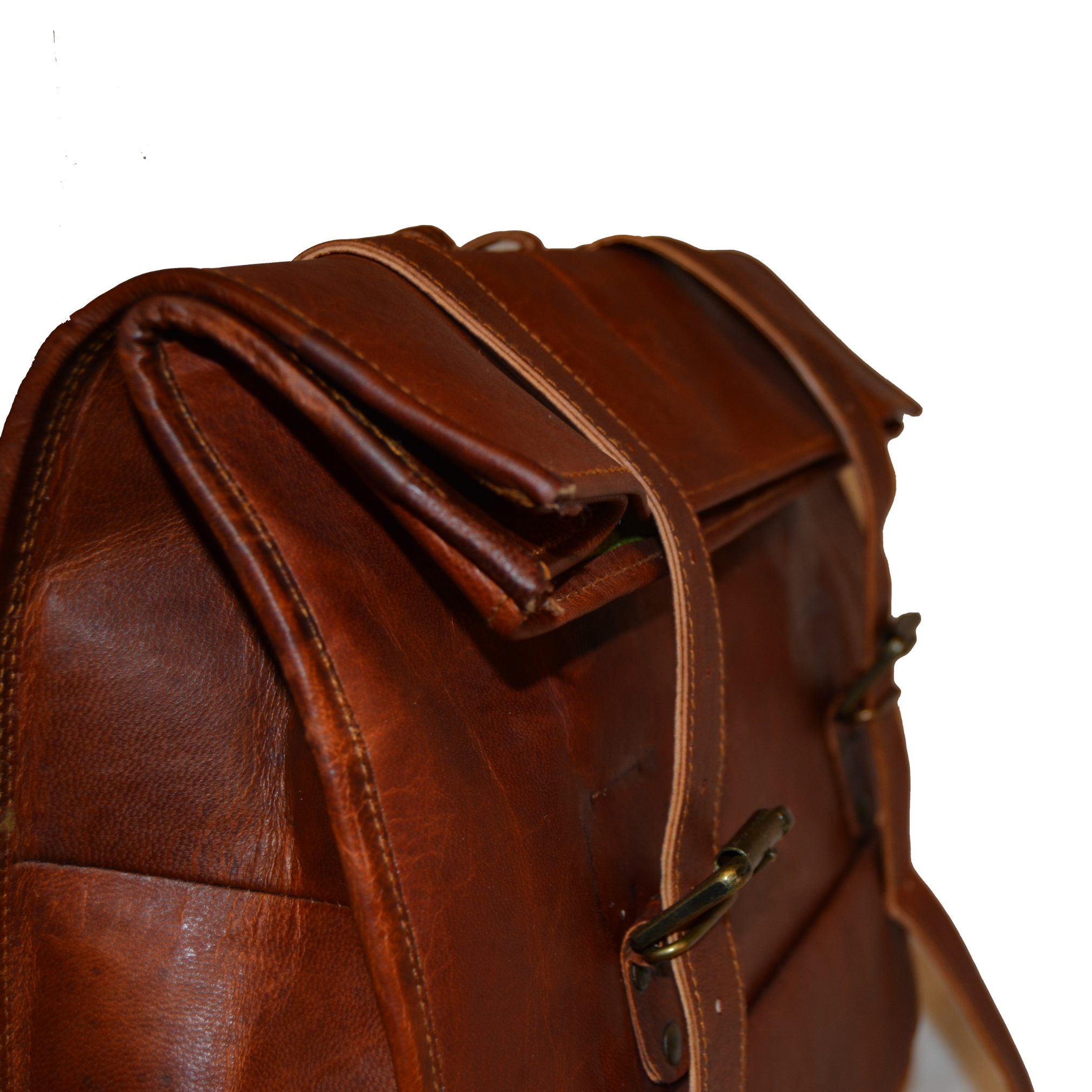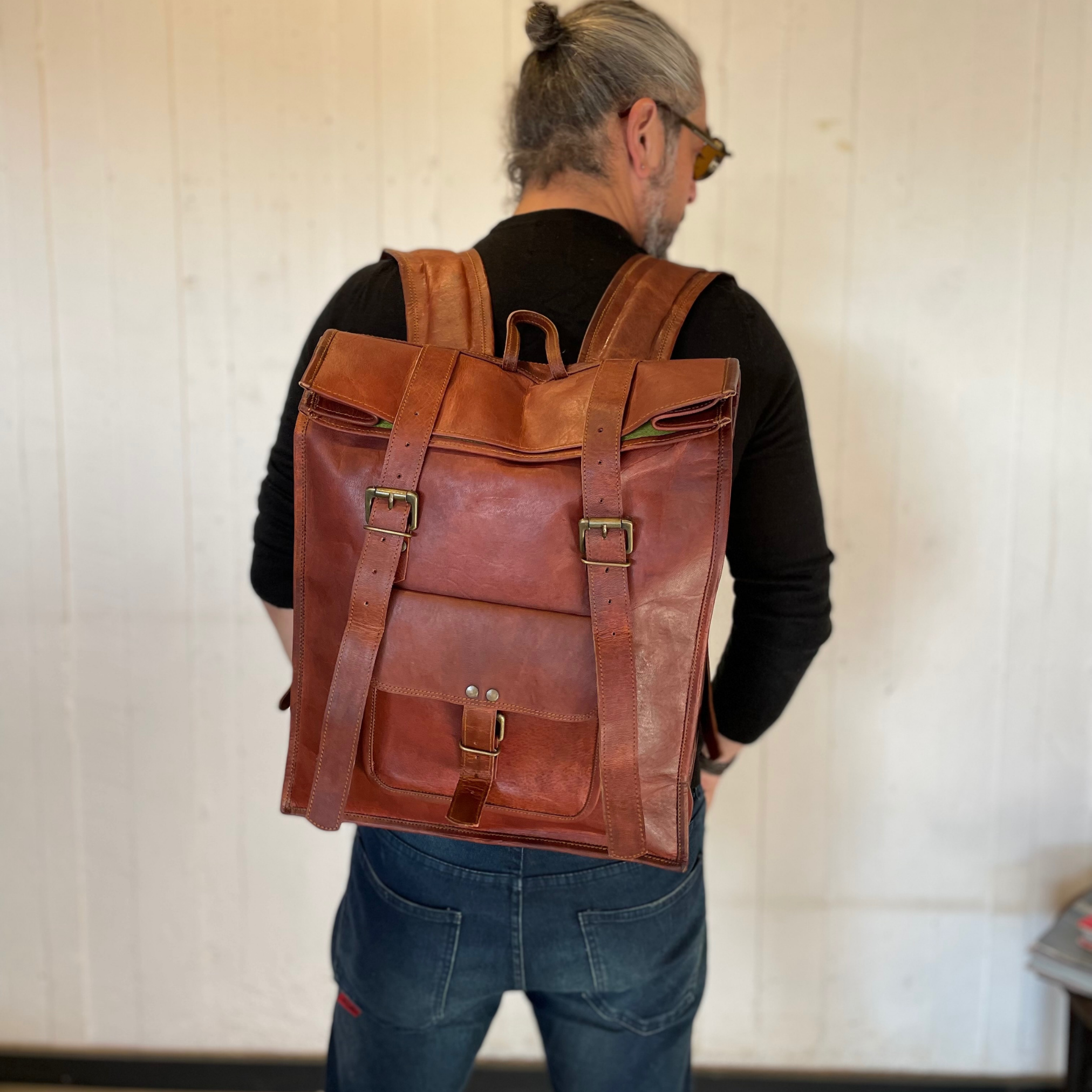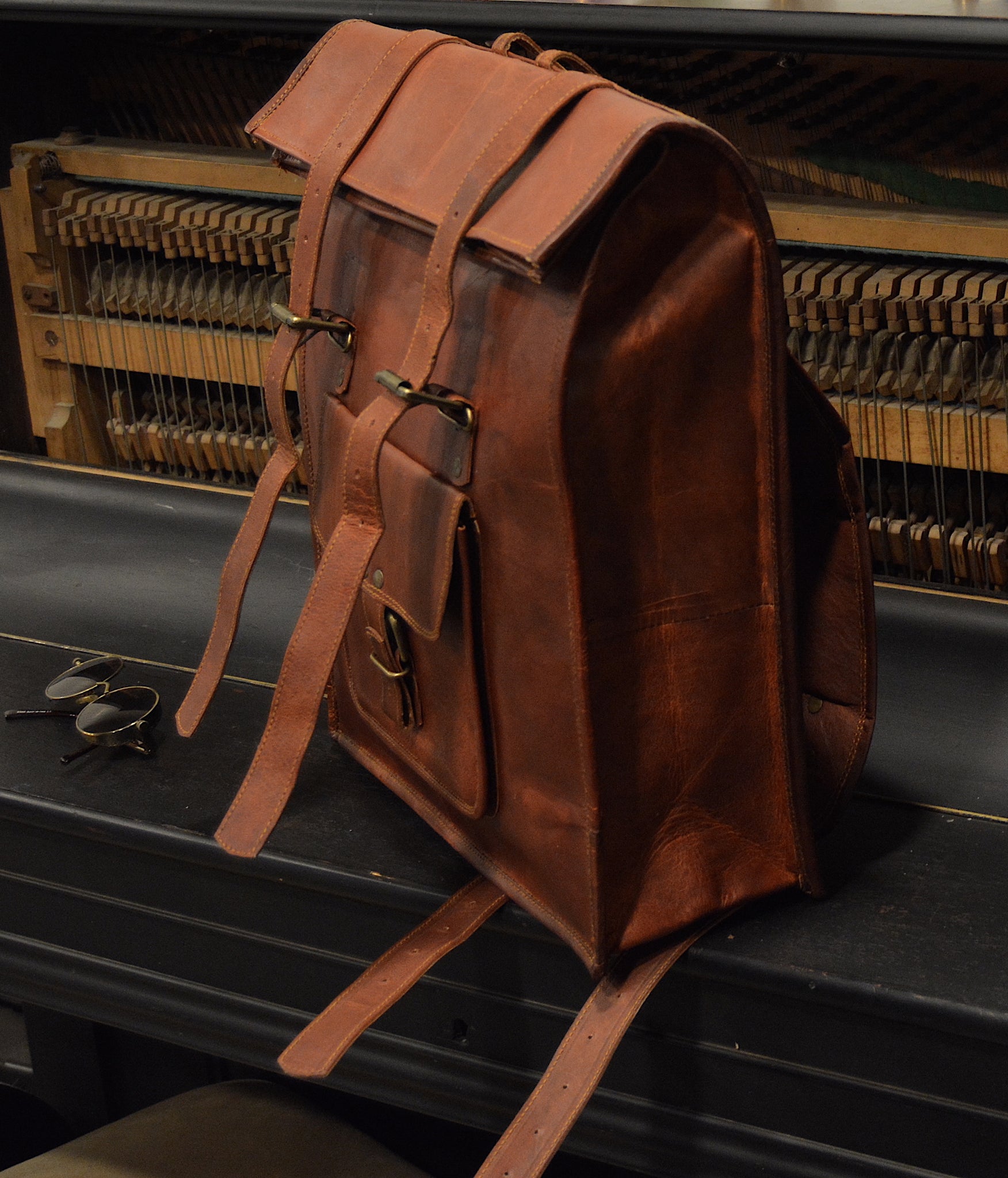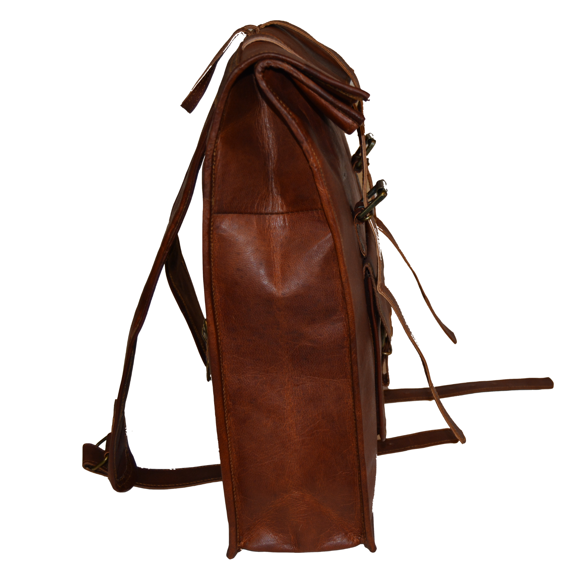 Mochila de cuero natural de tiro alto, cerrada con tirantes.