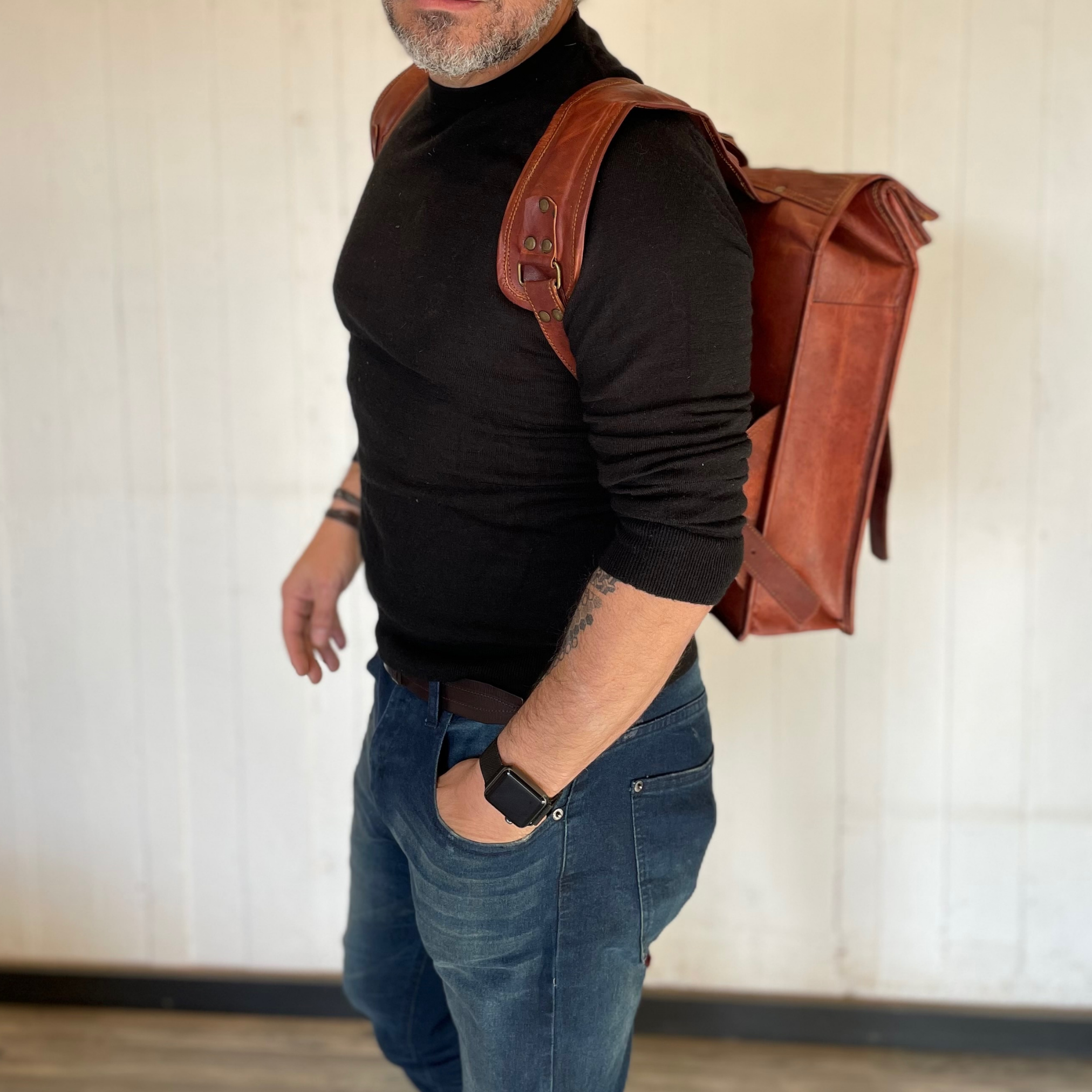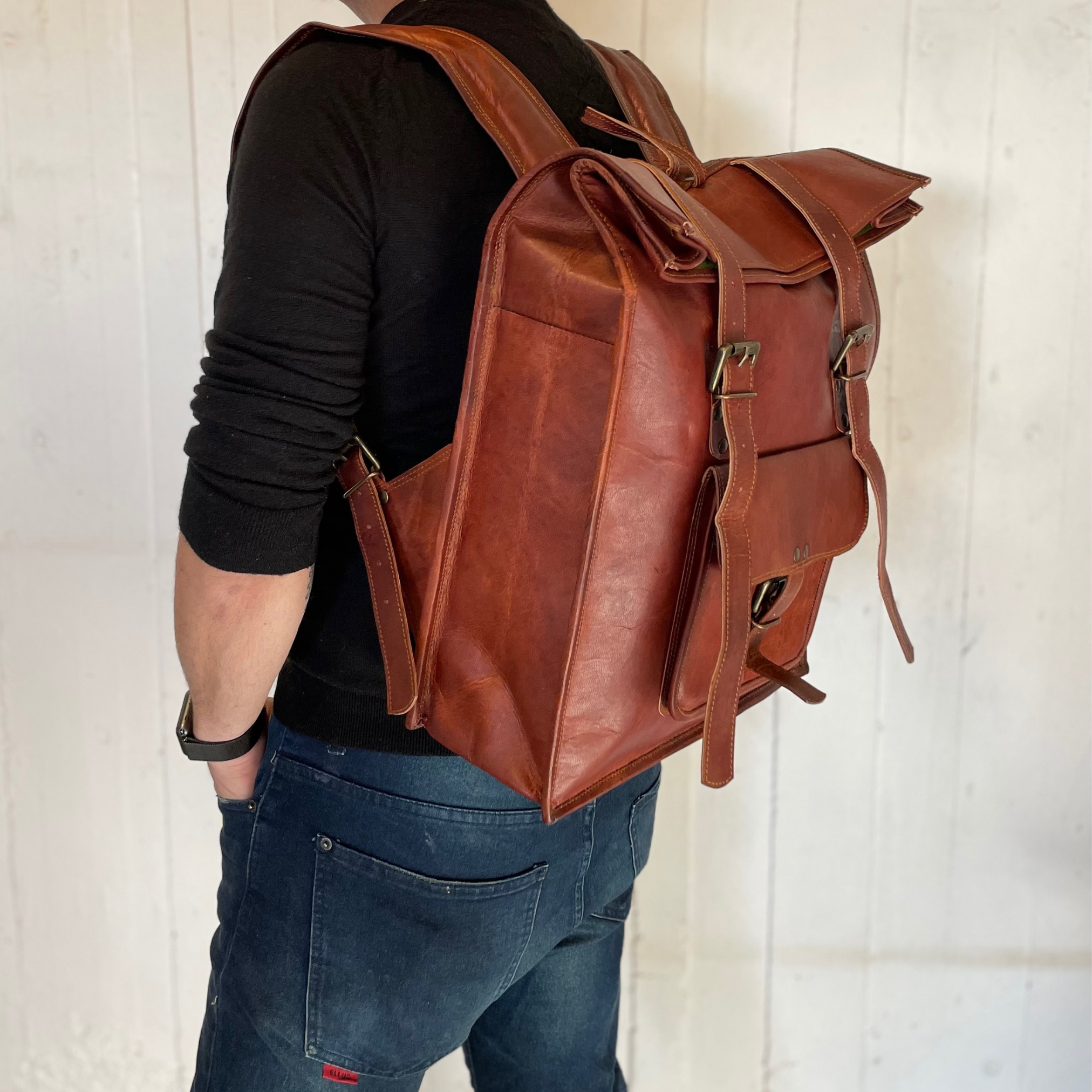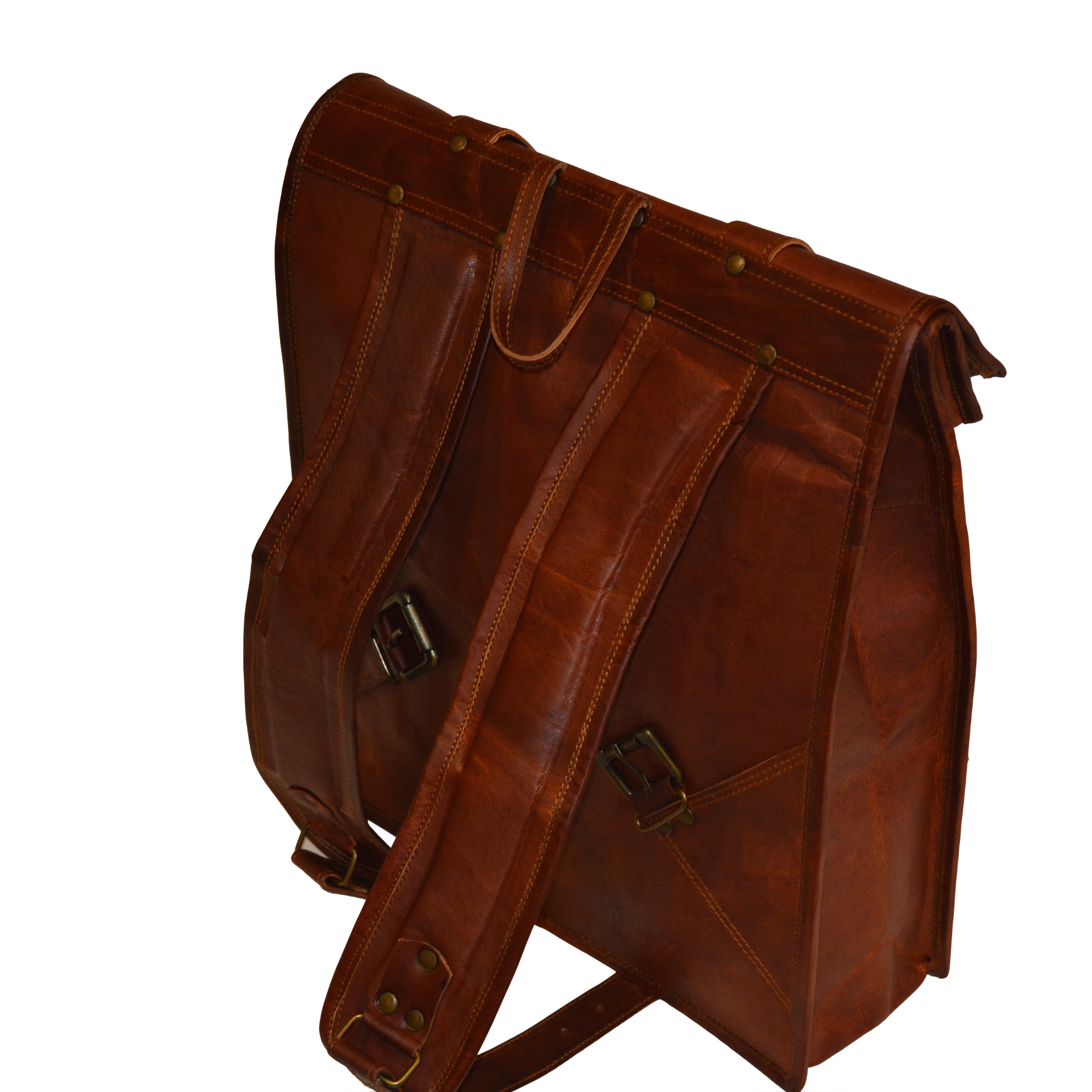 Mochila de cuero natural de tiro alto, cerrada con tirantes.