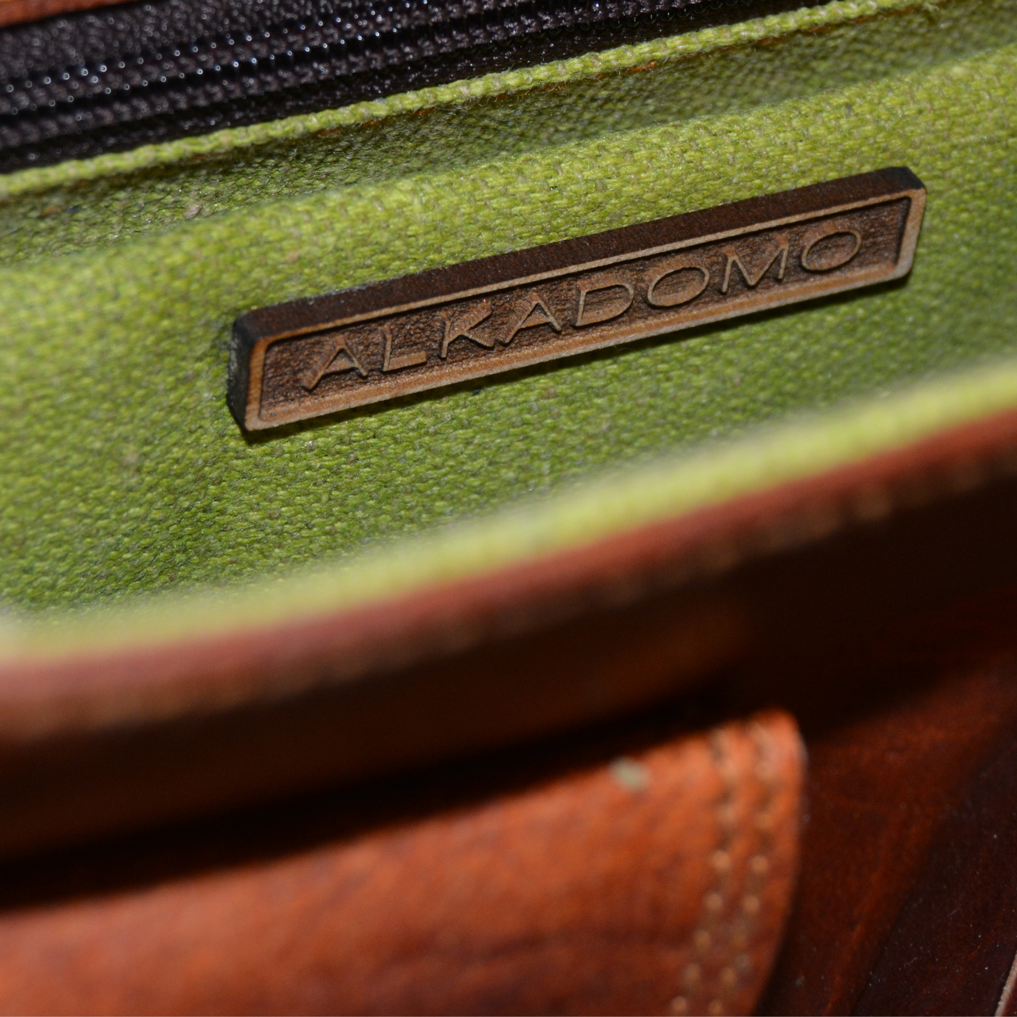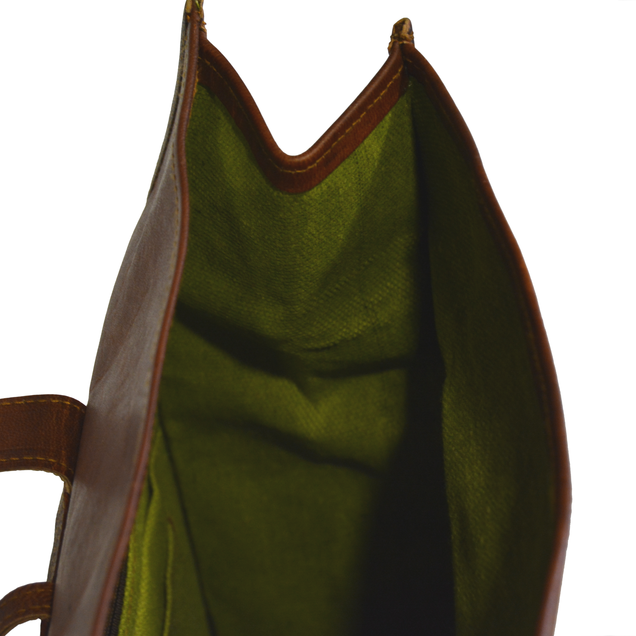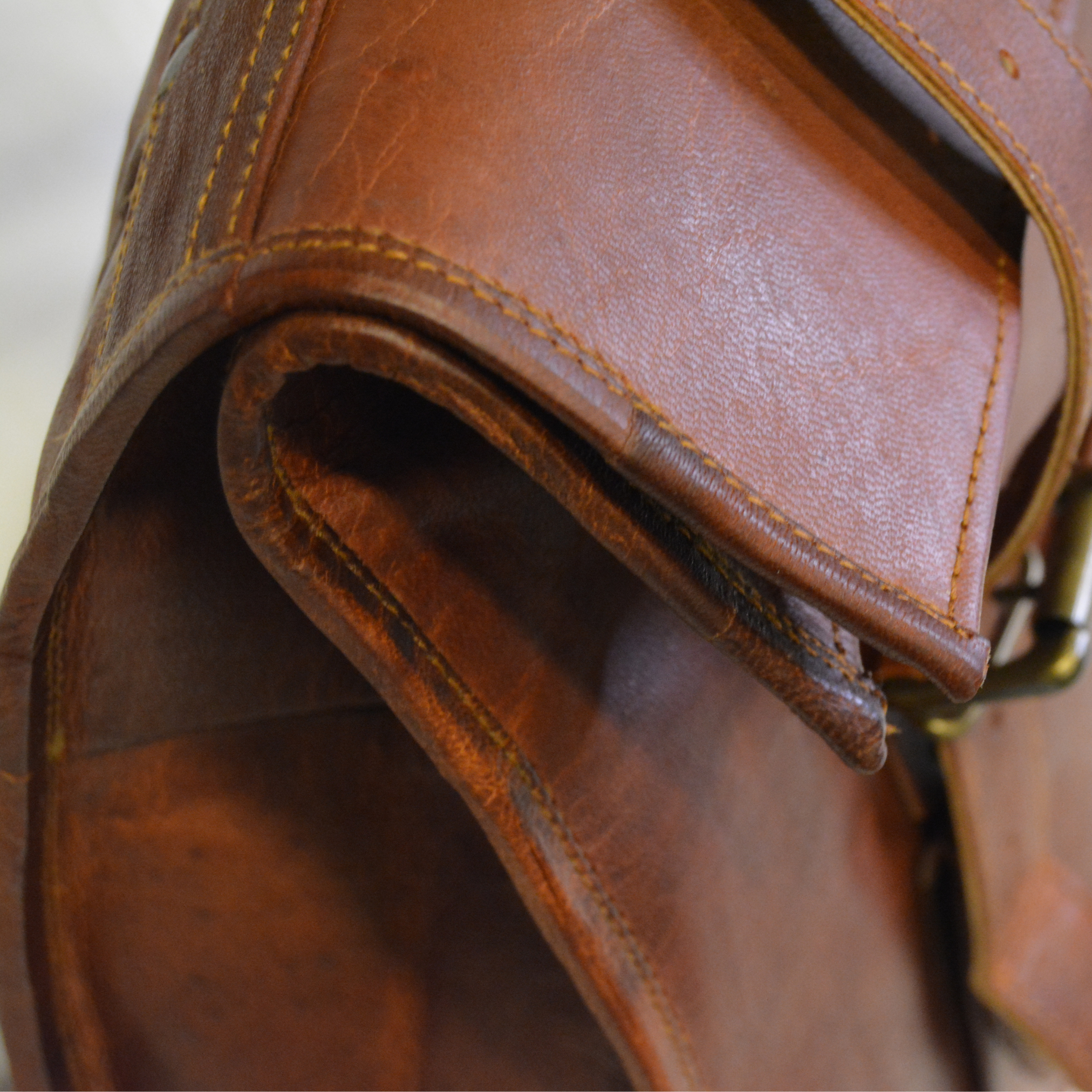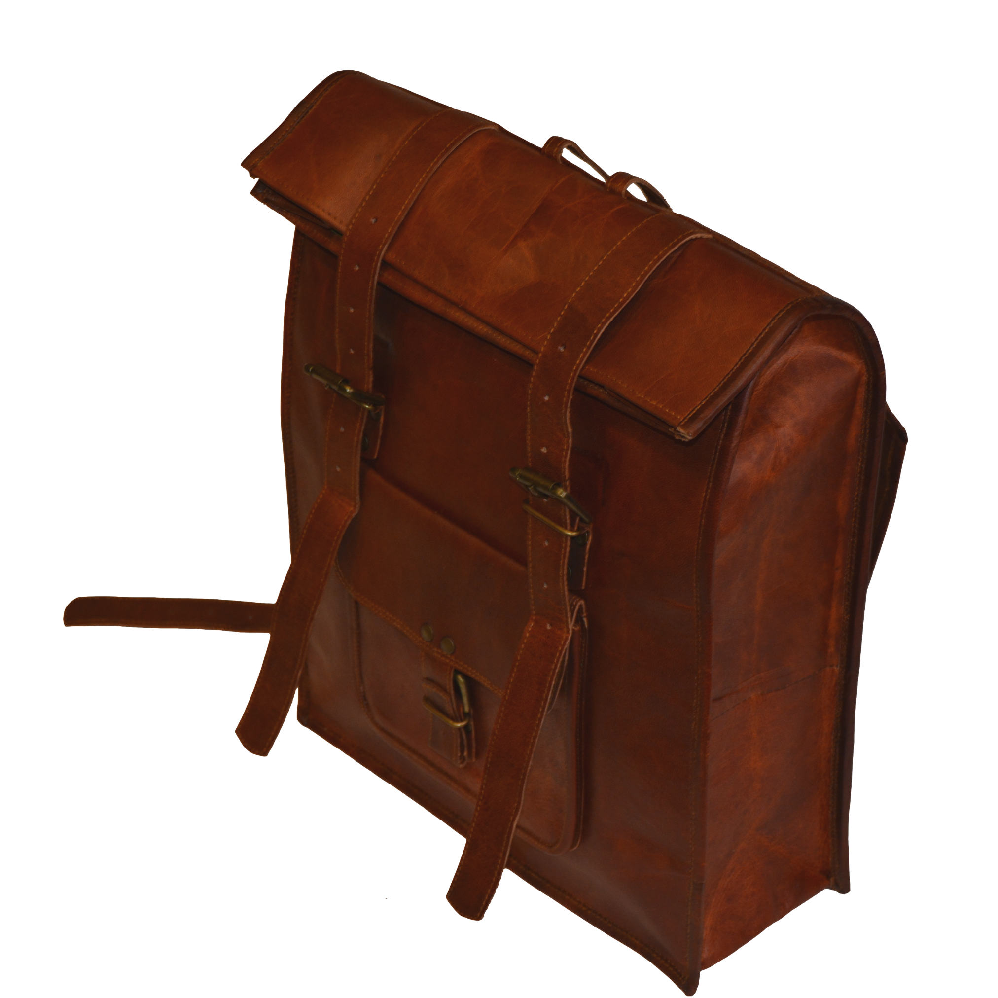 Mochila de cuero natural de tiro alto, cerrada con tirantes.